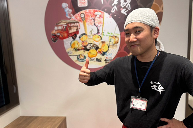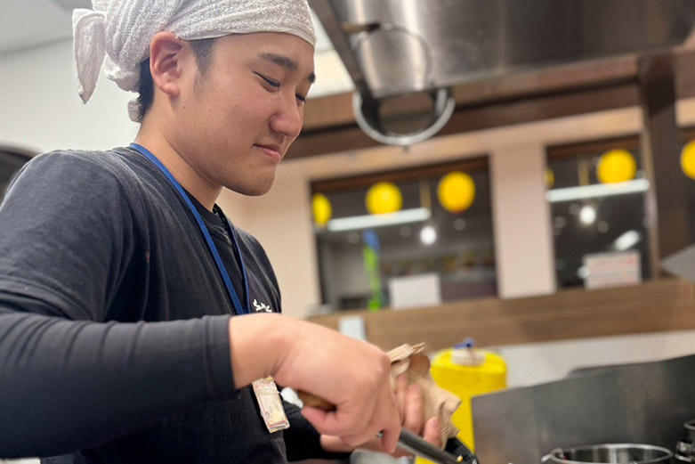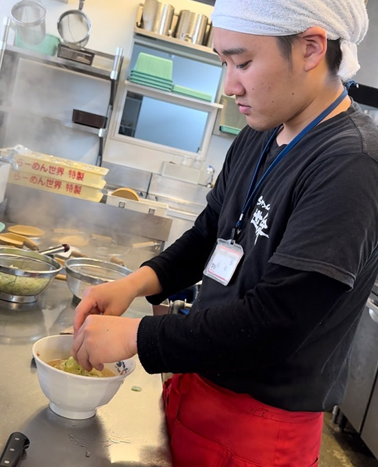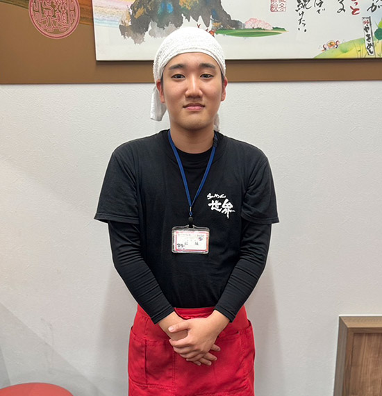 新川みどり野高等学校卒、2021年11月入社。「つけ麺まぜそば桜」富山魚津店と富山MAROOT店でホールと調理を行い、2022年12月に「らーめん世界」の新店・富山インター店に異動。オープンに向けてスタッフの育成を担う。異動してまもなくキッチンを任されるほど調理の腕を上げ、翌年11月に主任に昇格。高校時代はバスケットボール部と飲食店のアルバイトに打ち込む。休日は映画やゲームで気分転換。冬はスノーボードに没頭するとのこと。
